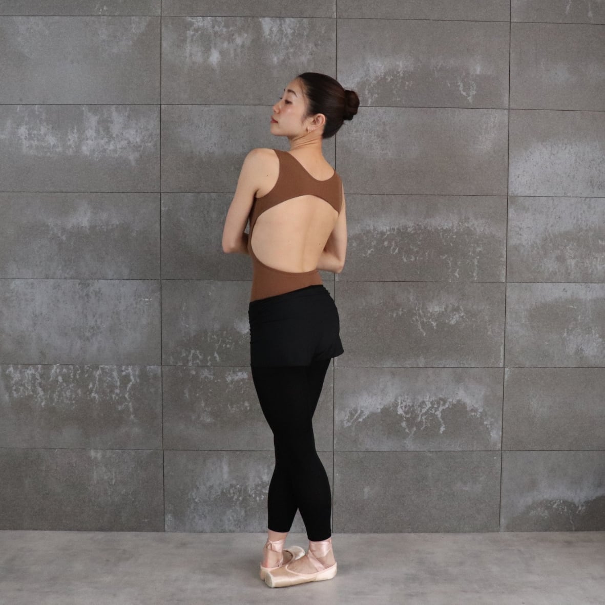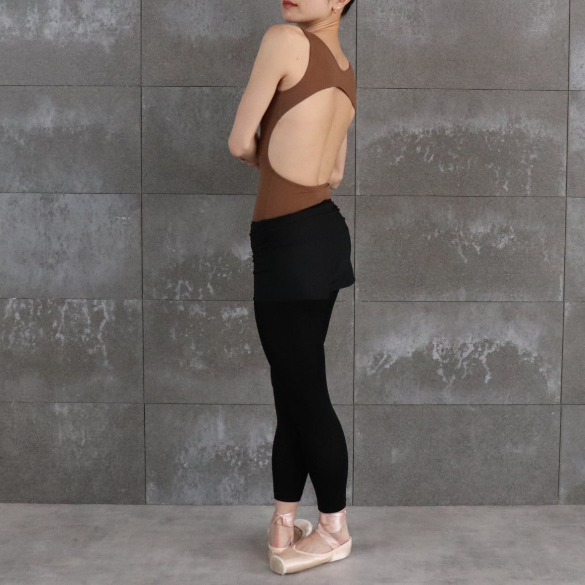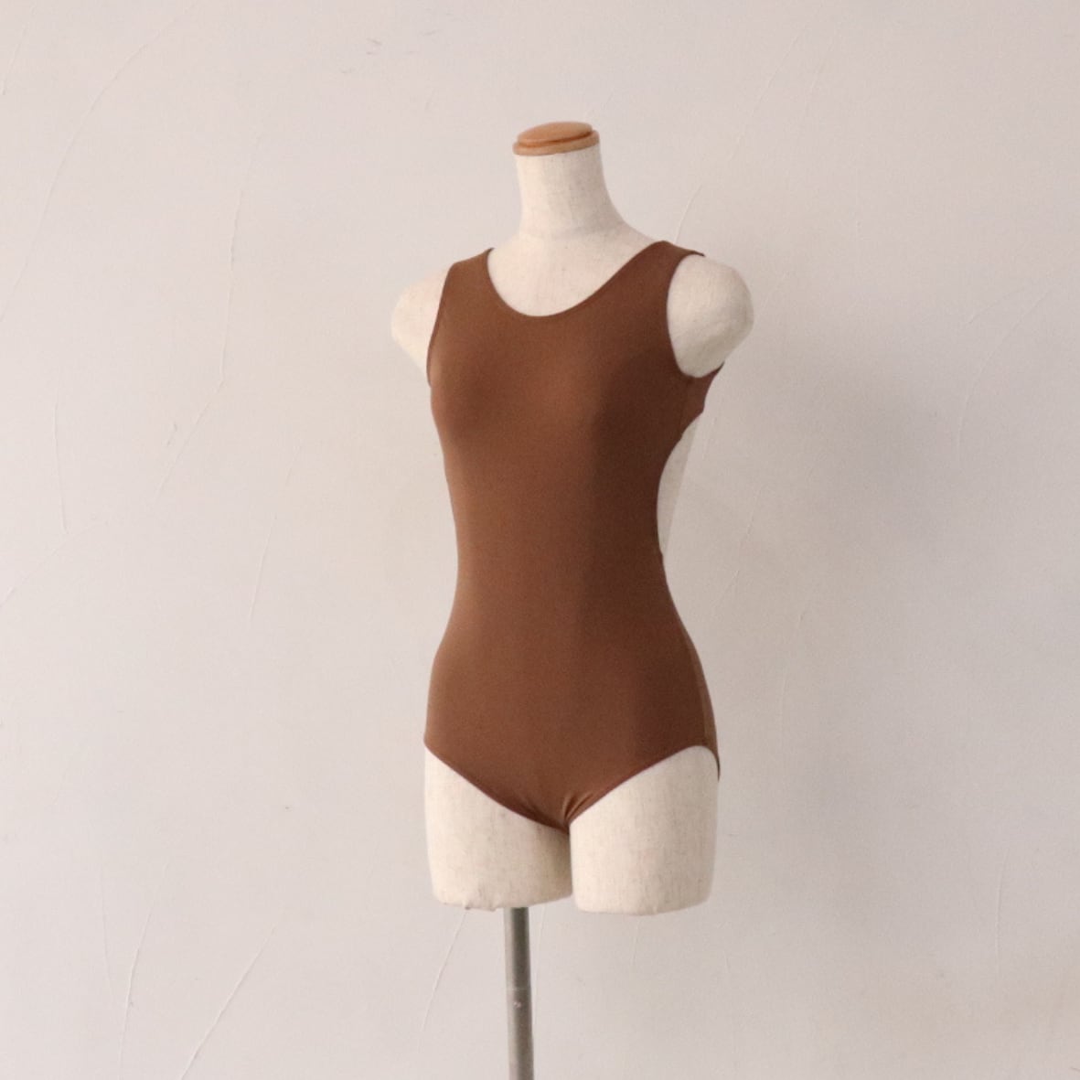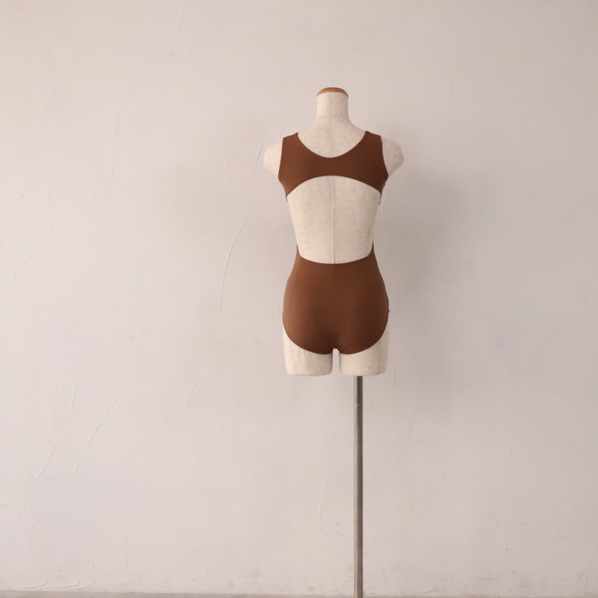 チョコレートモカ色のオープンバック型レオタード。