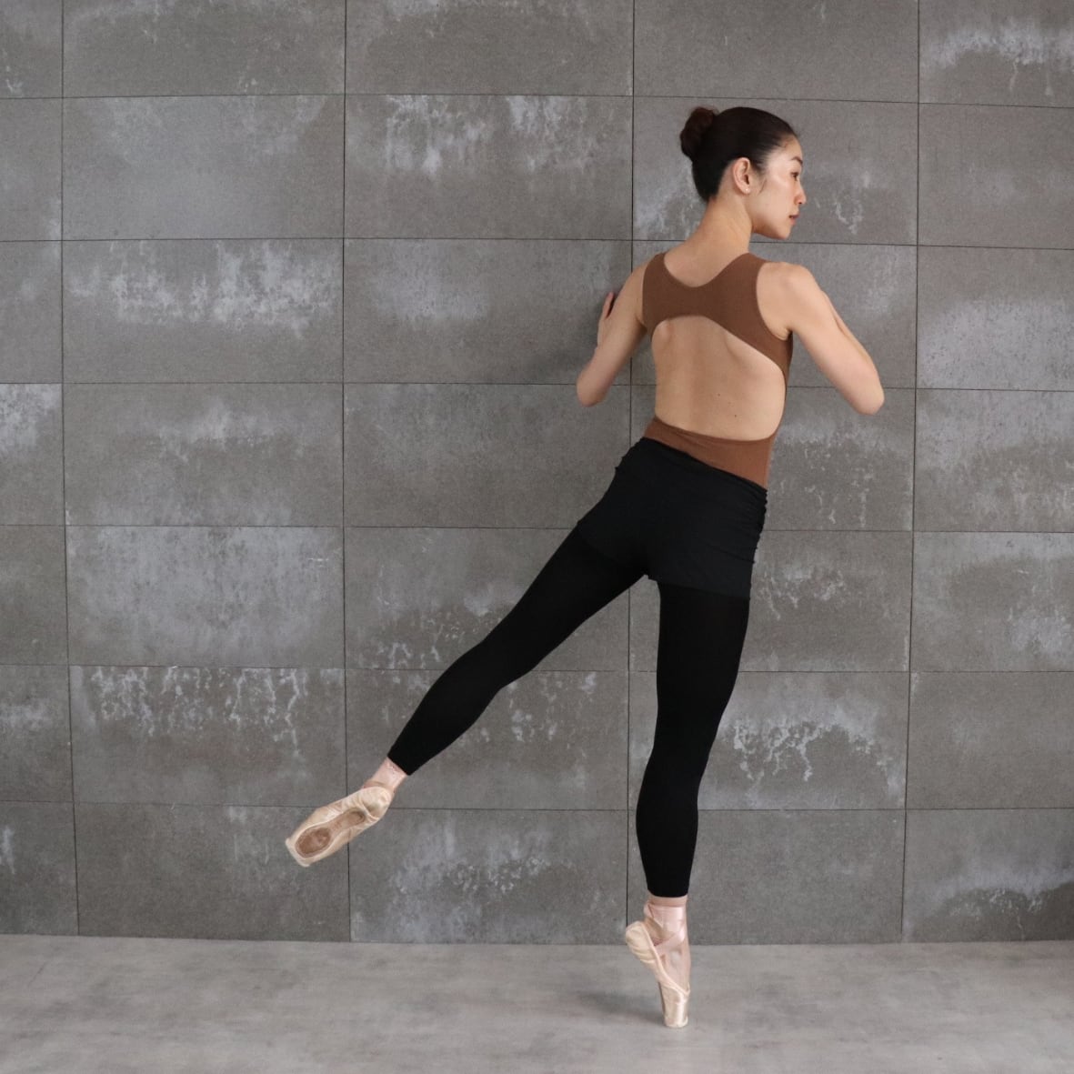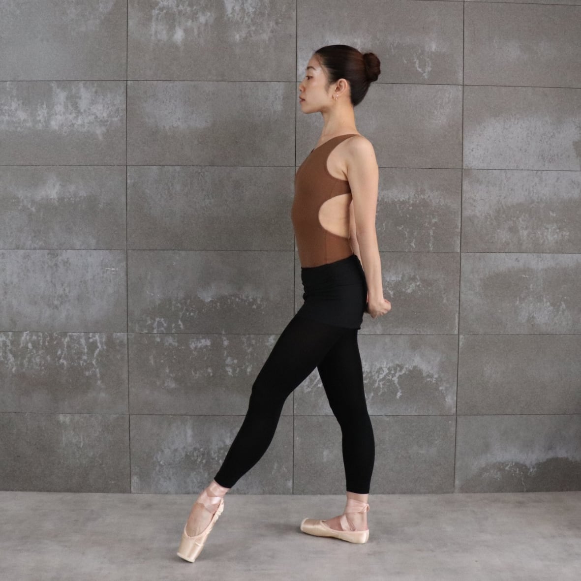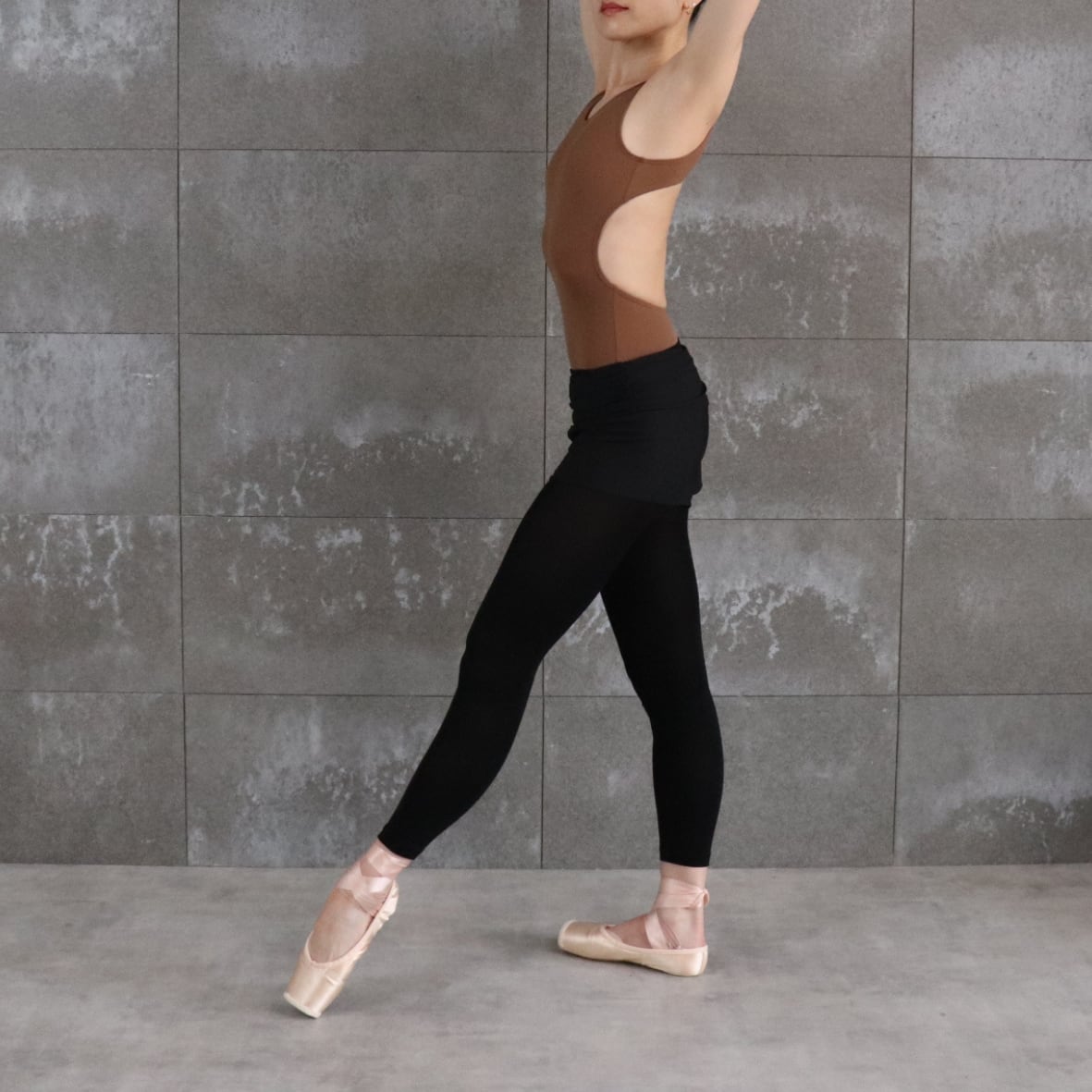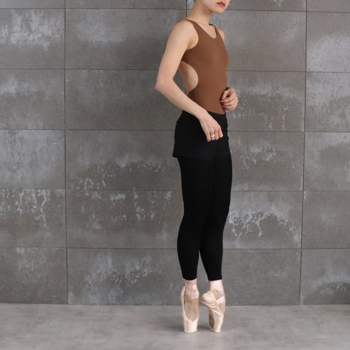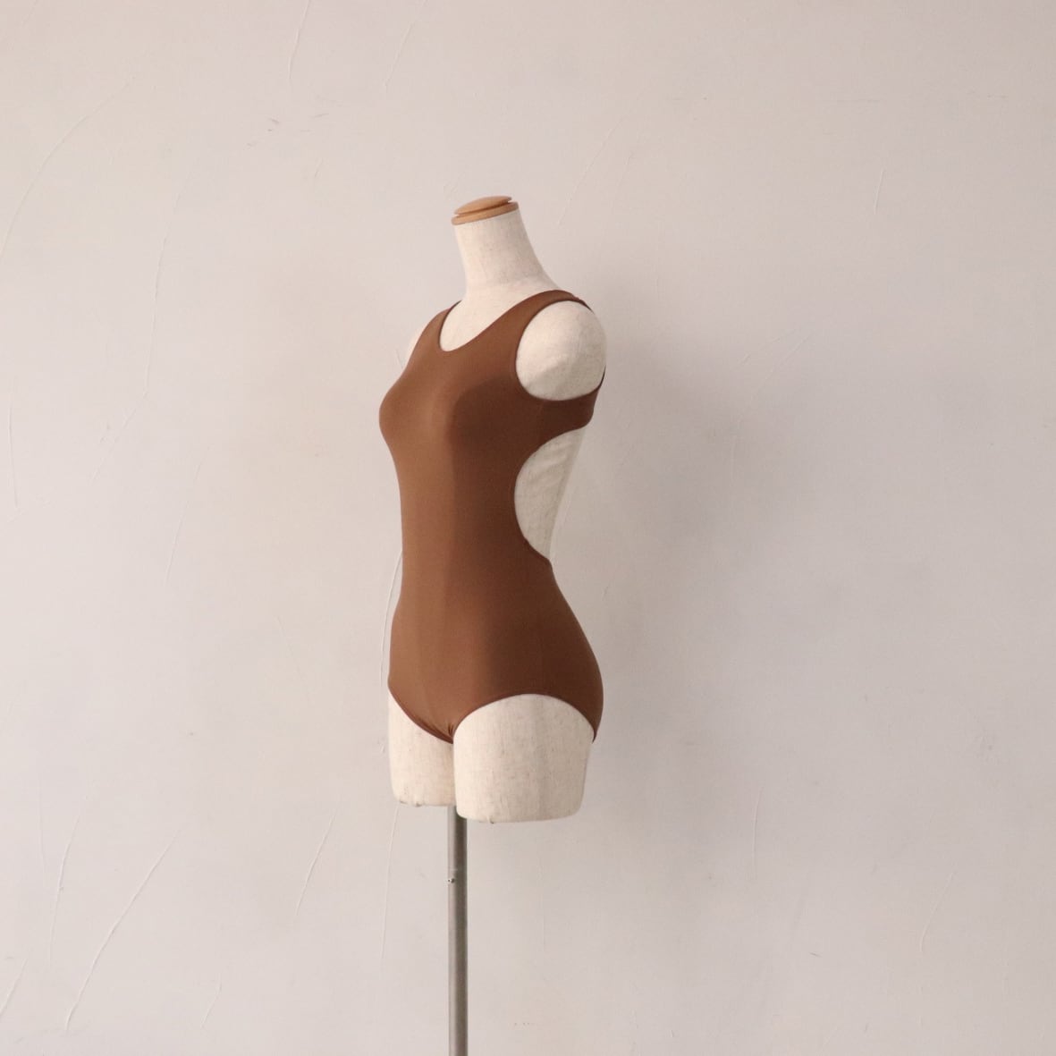 チョコレートモカ色のオープンバック型レオタード。